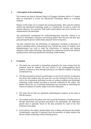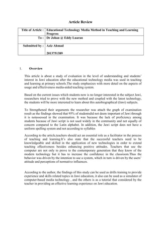 This article discusses a study that evaluated students' understanding and interest in Jawi (Arabic script used for Malay) education after using educational technology media in teaching at a primary school in Kelantan, Malaysia. The study found that using educational technology media like computers and multimedia software increased students' exam scores and interest in Jawi education compared to traditional teaching methods. The author concludes that instructional technology is important for developing students' knowledge and interest, and can improve exam performance when used appropriately in the classroom.