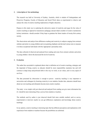 3. The author explains the definition of creative teaching but the study could be improved with surveys or interviews of students and teachers to gain more perspectives on creative teaching.