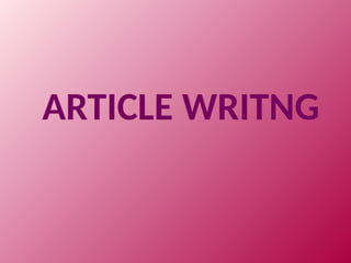 The document outlines the essential elements and structure of article writing, emphasizing the importance of a catchy title, engaging introduction, well-supported arguments, and a strong conclusion. It also details the required format for an article, including headings, bylines, and the body composed of multiple paragraphs covering various aspects of the topic. Additional tips for effective writing and a few sample topics are provided to guide the writer.