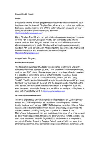 This document discusses new home theater gadgets that have been developed to connect televisions and home theater systems to the internet. It describes devices like the Kodak Theatre HD Player and Slingbox that allow users to access internet content and stream live TV to other devices. It also discusses the Rocketfish WirelessHD Adapter for connecting devices wirelessly and the URC Digital R50 universal remote control. The document is the first in a three-part series on innovative internet-connected devices shown at the 2009 Consumer Electronics Show.