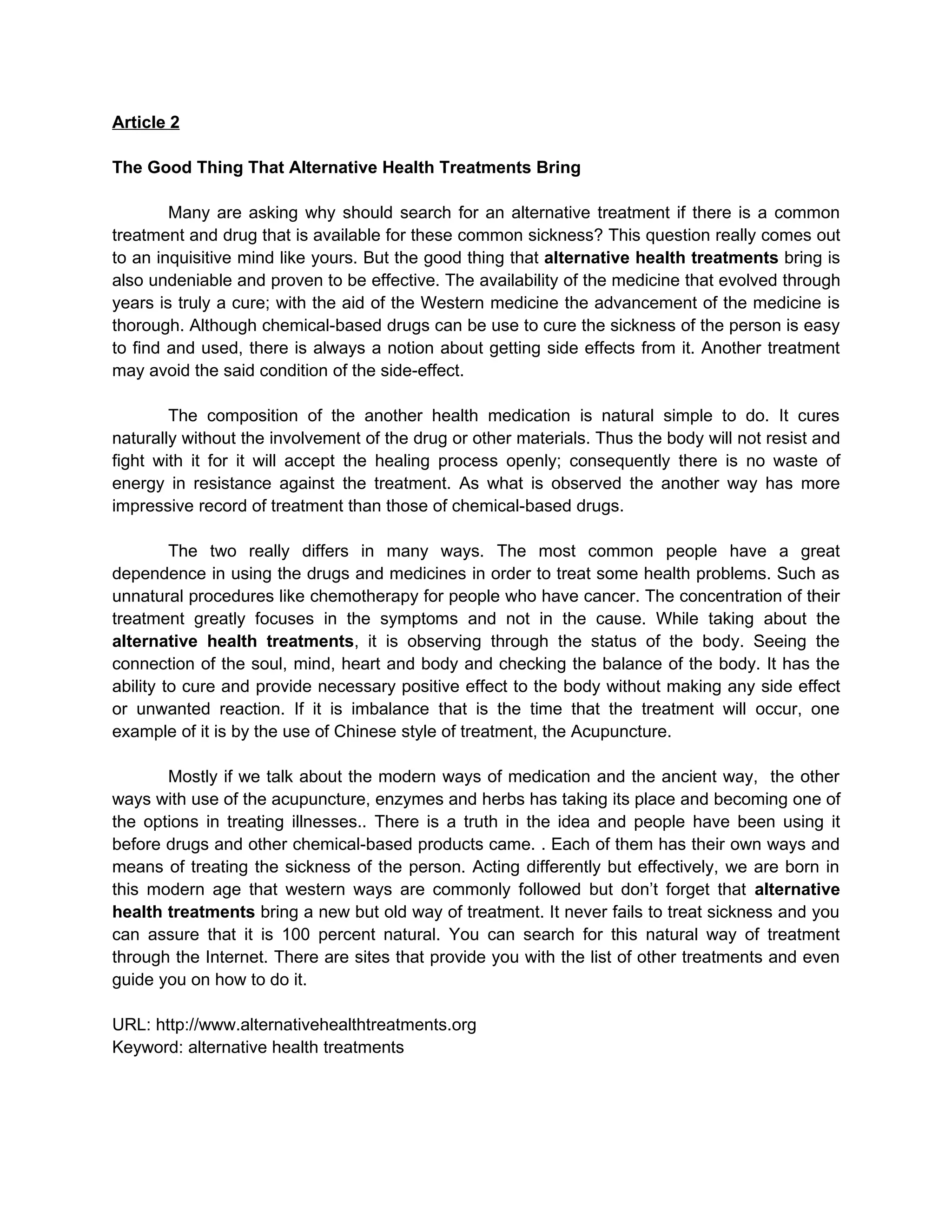 The document discusses the benefits of alternative health treatments compared to conventional Western medicine. Alternative treatments are natural and avoid side effects since they work with the body instead of against it. They treat the underlying causes of illness rather than just the symptoms. Examples given are acupuncture and traditional Chinese medicine. While Western drugs are common, alternative therapies provide ancient healing methods that are gaining recognition as highly effective options for treatment.