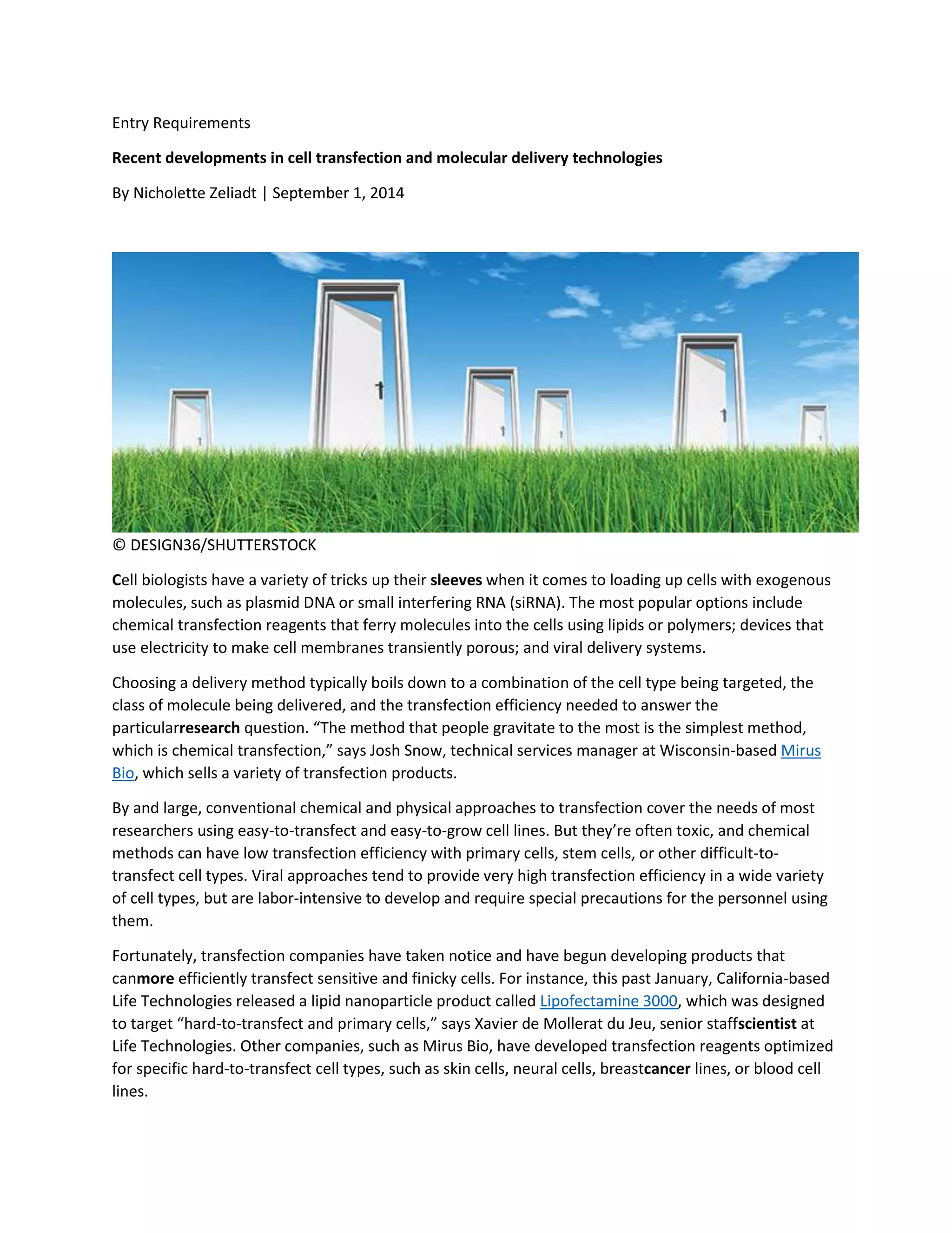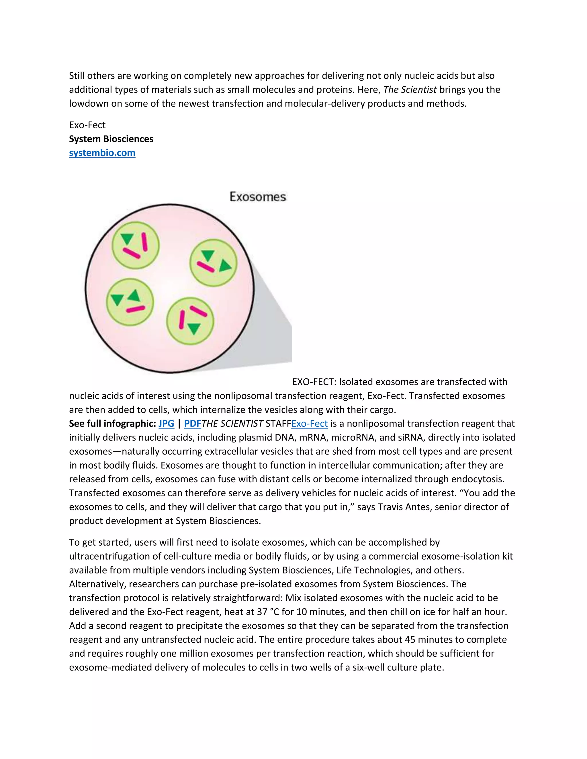 Cell biologists have several options for delivering exogenous molecules into cells, including chemical and physical transfection methods as well as viral vectors. Recently, new products have targeted difficult to transfect cell types. Exo-Fect transfects isolated exosomes with nucleic acids, which are then delivered to cells. Cellsqueeze is a microfluidic system that mechanically deforms cells to form transient pores for molecule entry without toxicity. Both aim to more efficiently transfect hard-to-transfect cells like stem cells and primary cells.