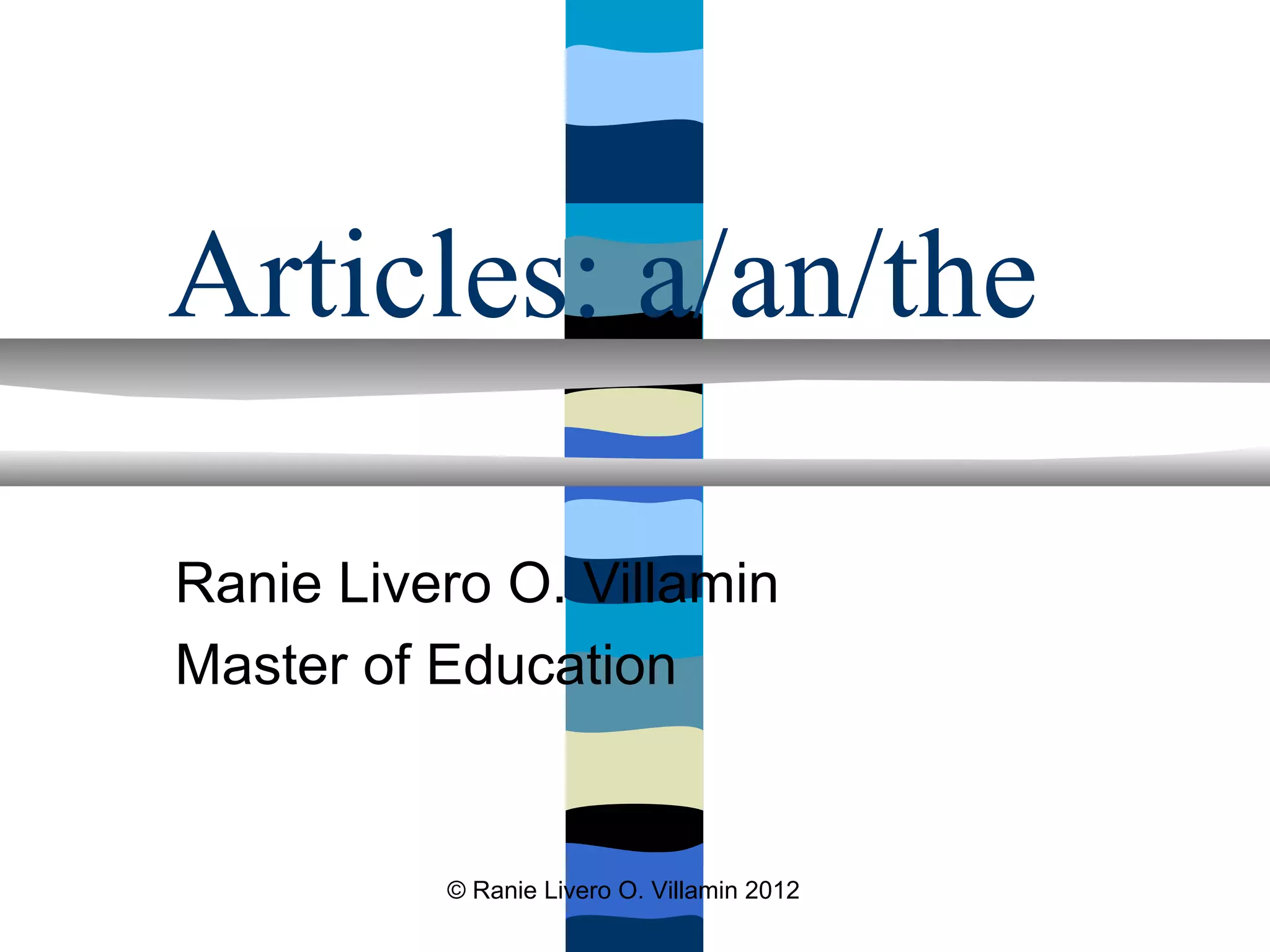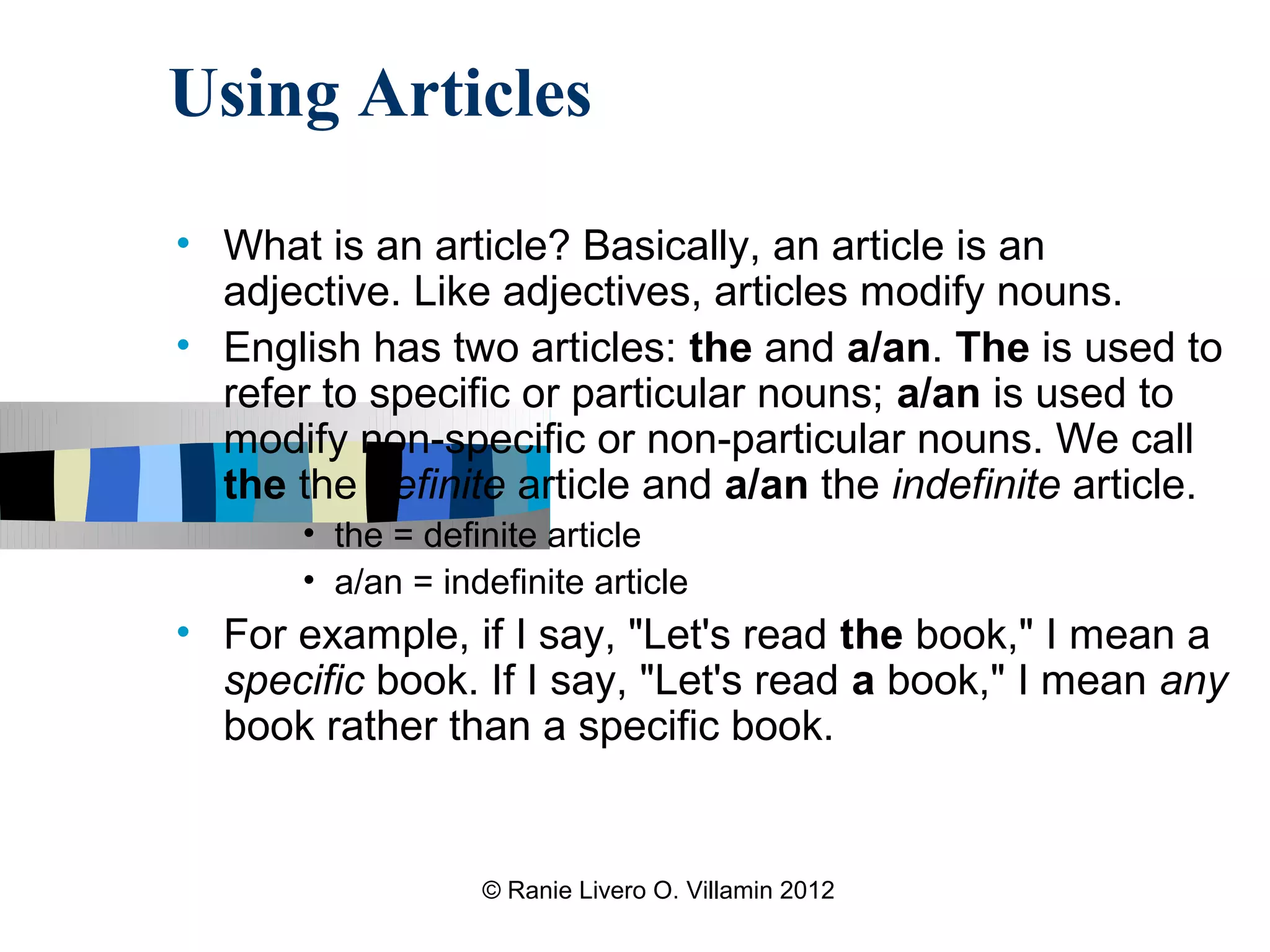 The document discusses the use of articles in English. It explains that there are definite ("the") and indefinite ("a"/"an") articles. The definite article refers to specific nouns, while the indefinite article refers to non-specific nouns. It provides examples of when to use definite vs. indefinite articles with countable and uncountable nouns. It also discusses geographical uses of articles and cases when articles are omitted.