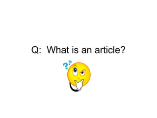 1. There are only two articles: a/an and the. Articles modify nouns and provide information about them.