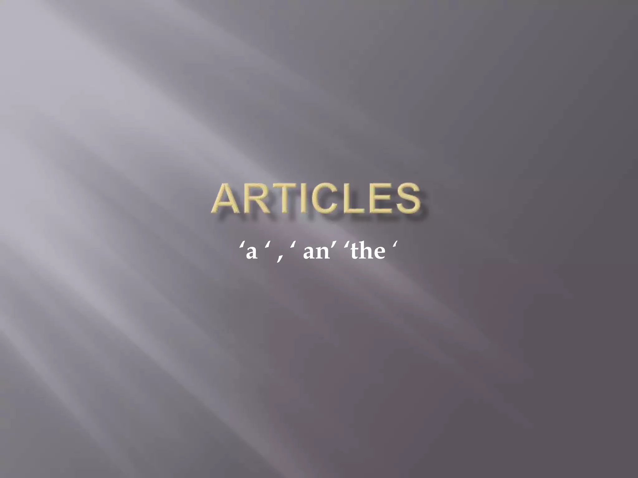 There are two types of articles: indefinite and definite. The indefinite articles "a" and "an" are used with singular nouns and "a" is used before words beginning with consonant sounds, while "an" is used before words beginning with vowel sounds. The definite article "the" refers to a specific or particular noun and is used with singular, plural, and uncountable nouns as well as adjectives, names of countries, seas, religions, newspapers, titles, and famous events.