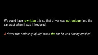 The document outlines the rules regarding the use of indefinite and definite articles in English grammar. It includes specific rules for when to use 'a' and 'an', as well as exceptions and unique cases. Additionally, it presents dos and don’ts for article usage and provides resources for further learning.