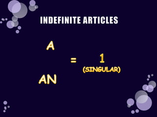 This document discusses definite and indefinite articles in English. It provides examples of using "a/an" versus "one" when referring to singular countable nouns like bicycle and elephant. It also shows how to use "the" when something has already been mentioned or is unique in the context.