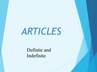 The document discusses definite and indefinite articles in English. It explains that the indefinite articles "a" and "an" are used before consonant and vowel sounds, with "an" used before words beginning with voiced letters and "a" used before voiceless letters or consonant sounds. The definite article "the" is used to refer to specific or defined nouns whether they are singular or plural forms.