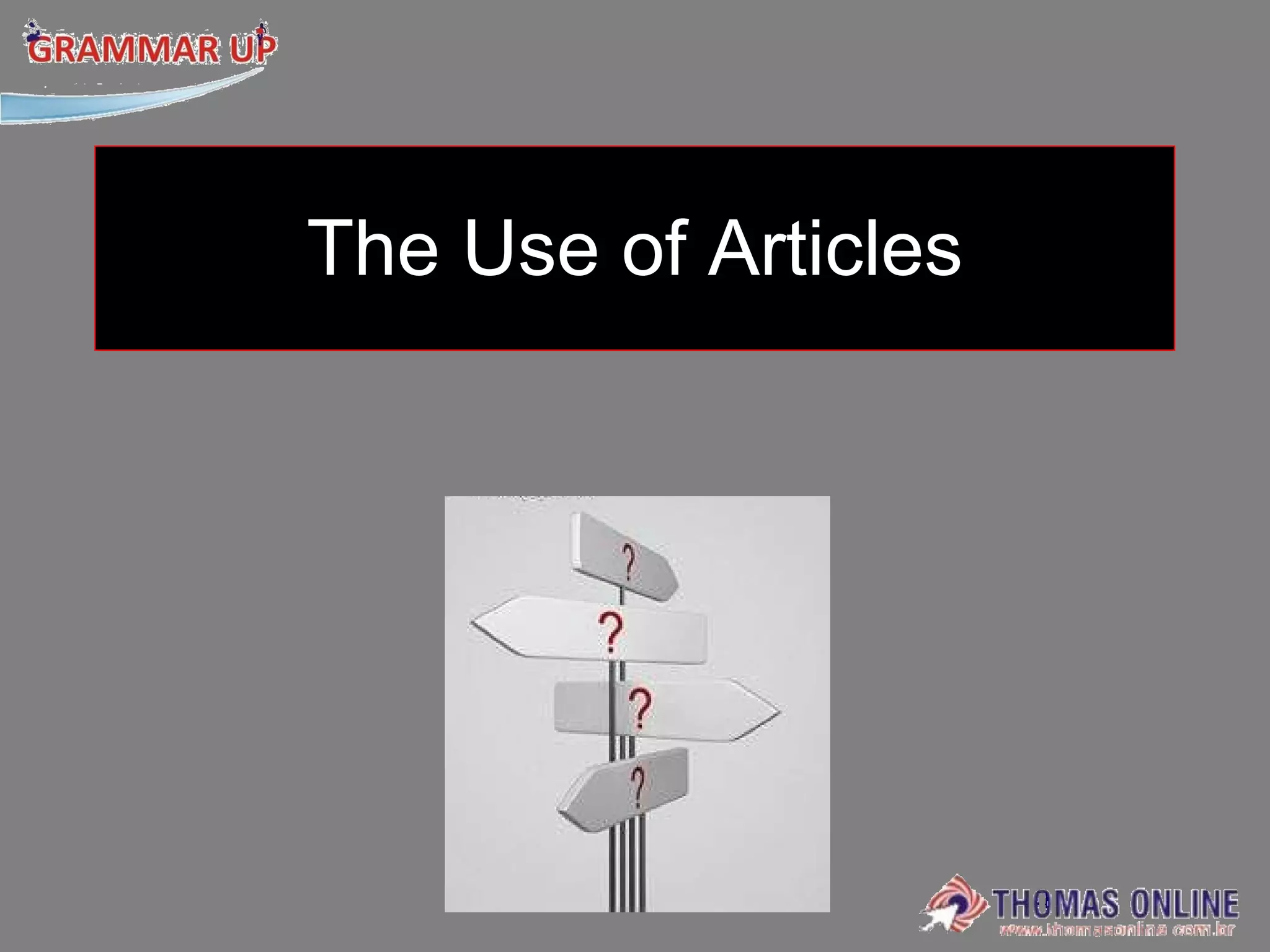 Articles are words like "the", "a", and "an" that are used before nouns. There are three choices for articles: "the" for specific or definite nouns, "a" or "an" for general or indefinite singular nouns, and nothing for plural or uncountable nouns. To choose the correct article, you must consider whether the noun is definite or indefinite, countable or uncountable, and singular or plural. The definite article "the" is used when the noun is unique or specifically referred to based on context. The indefinite articles "a" or "an" are used when the noun is nonspecific or generalized.