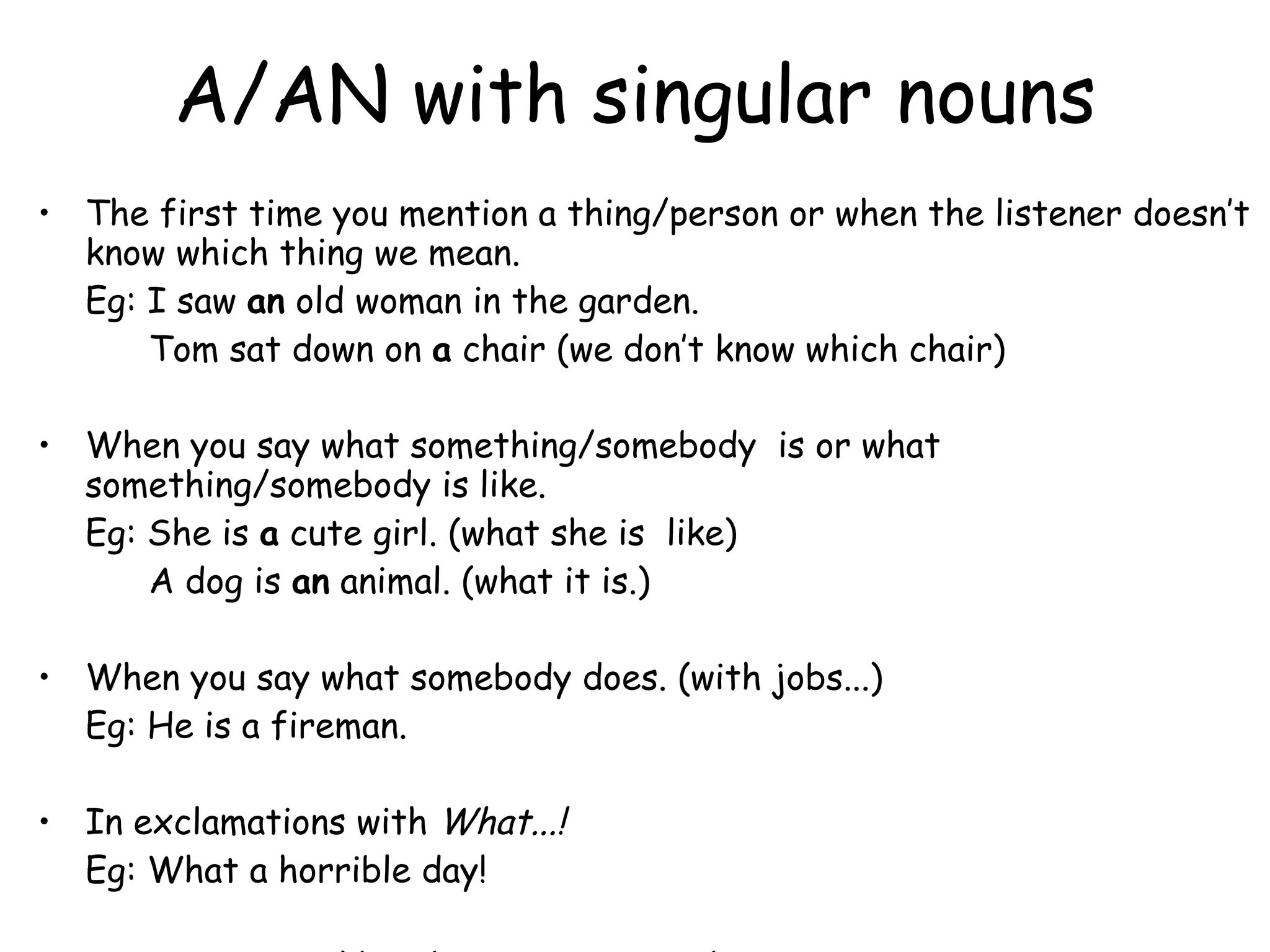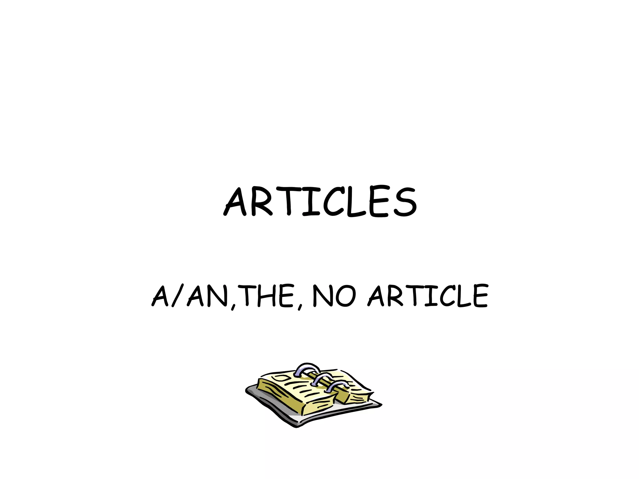 The document discusses the use of articles (a/an, the, no article) in English. It provides rules for when to use a/an, the, or no article with singular and plural nouns, locations, institutions, days/months, occupations, geographical areas, buildings and more. It also includes examples and a short quiz to check understanding of the rules.