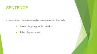 This document discusses English grammar and the use of articles. It explains that articles are words used to modify nouns, including the indefinite articles "a" and "an" and the definite article "the". The indefinite article refers to any nonspecific person, place or thing, while the definite article refers to a specific noun. The document provides examples of when to use each type of article with both countable and uncountable nouns in different contexts.