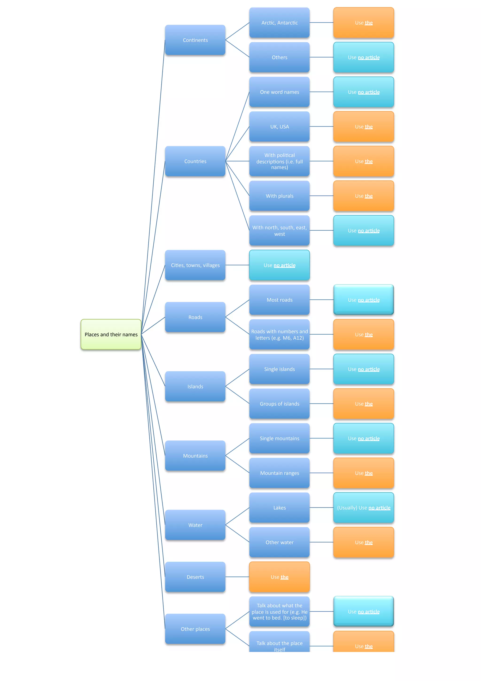 This document provides guidance on article usage (a/an or the) with nouns in the English language. It addresses whether to use an article based on factors such as if the noun is being mentioned for the first time, if it is countable or uncountable, singular or plural, a name, or refers to a place. The document contains two charts that outline specific rules for article usage with nouns referring to places and their names.