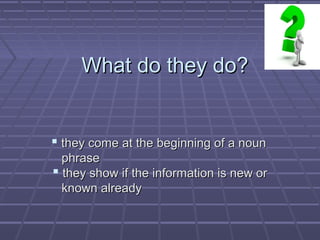 This document discusses the definite and indefinite articles in English - "a", "an", and "the". It provides rules for using each article and examples. The main points are: