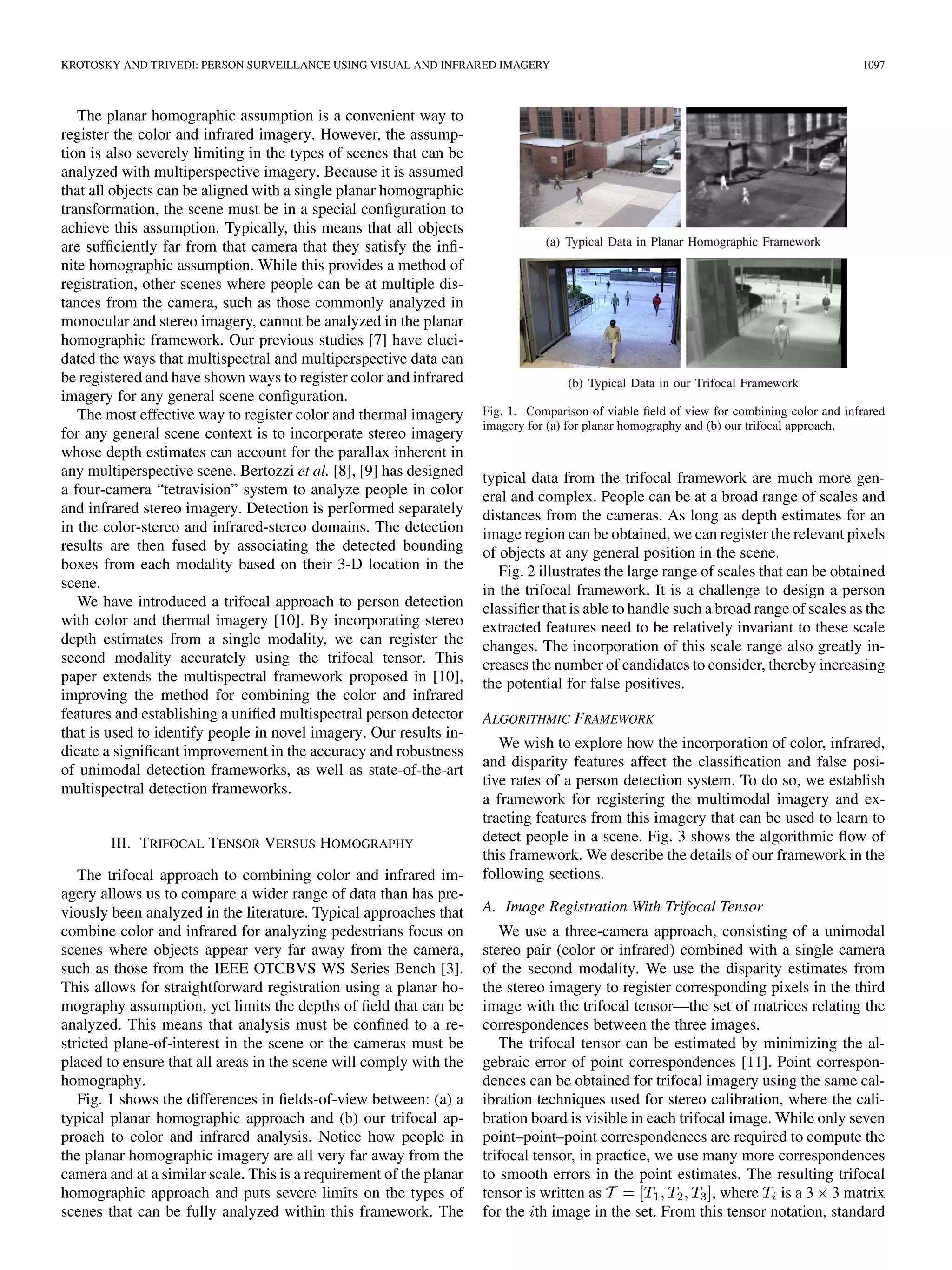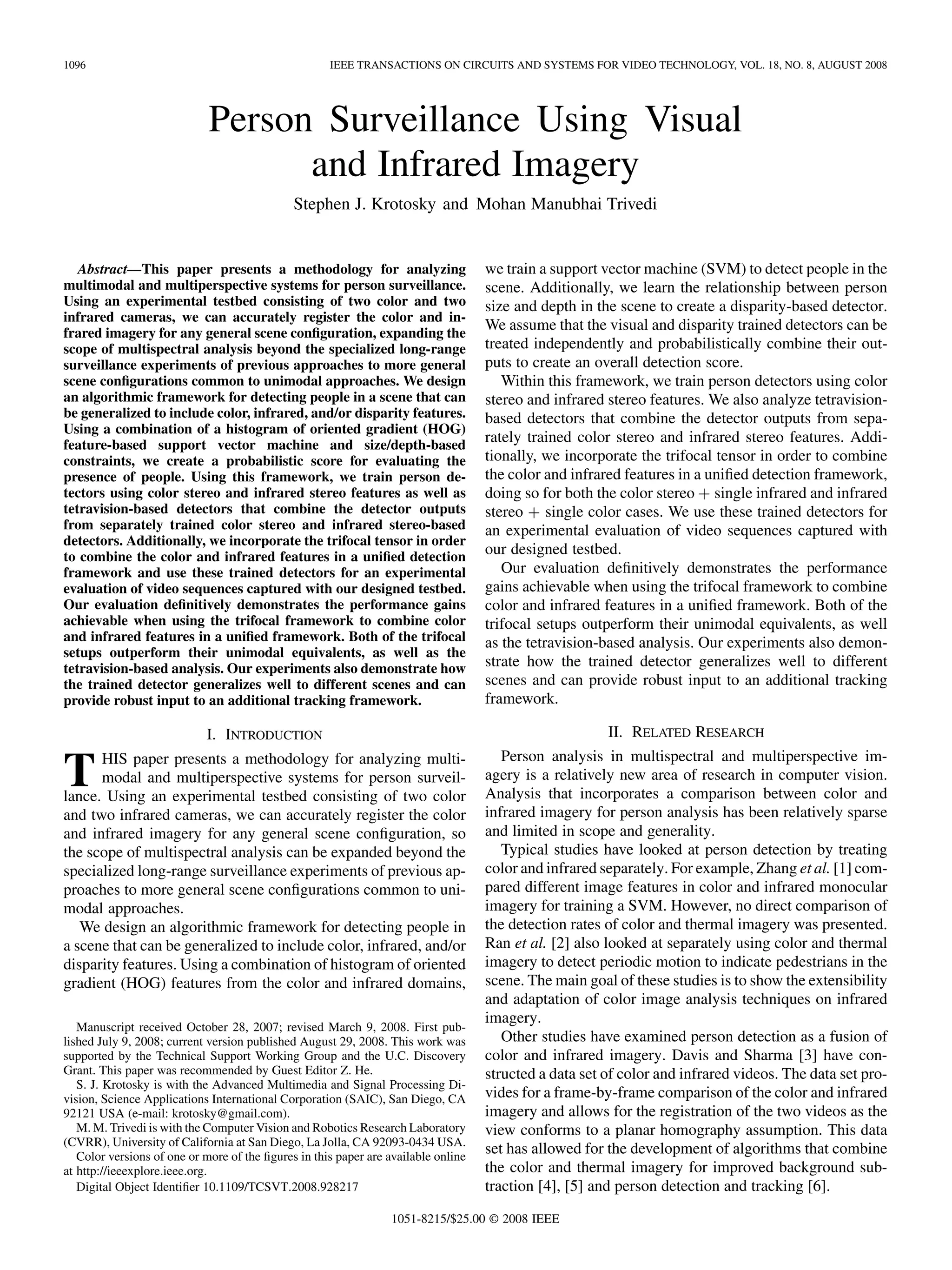 Il documento presenta una metodologia per la sorveglianza di persone utilizzando un sistema multimodale composto da due telecamere a colori e due a infrarossi. Utilizzando un algoritmo basato su HOG e un sistema trifocale, gli autori dimostrano che la combinazione delle immagini migliora significativamente il riconoscimento delle persone rispetto ai metodi unimodali. I risultati sperimentali indicano un tasso di rilevamento del 92,15% con un basso numero di falsi positivi, evidenziando l'efficacia della tecnologia proposta.