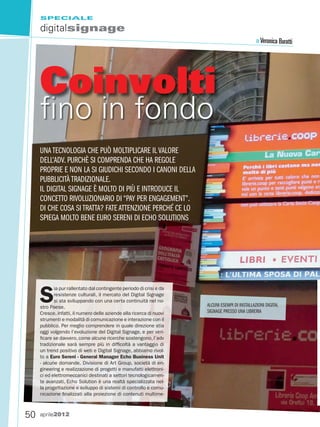 Il documento analizza l'andamento del mercato del digital signage in Italia, evidenziando come stia crescendo nonostante le difficoltà dovute alla crisi economica e alla concorrenza con l'adv tradizionale. Si sottolinea l'importanza del concetto di "pay per engagement" e la necessità di un'evoluzione culturale e tecnologica nel settore. Si conclude che il digital signage offre un potenziale superiore rispetto alla pubblicità tradizionale, ma è ancora in fase embrionale nel nostro paese.