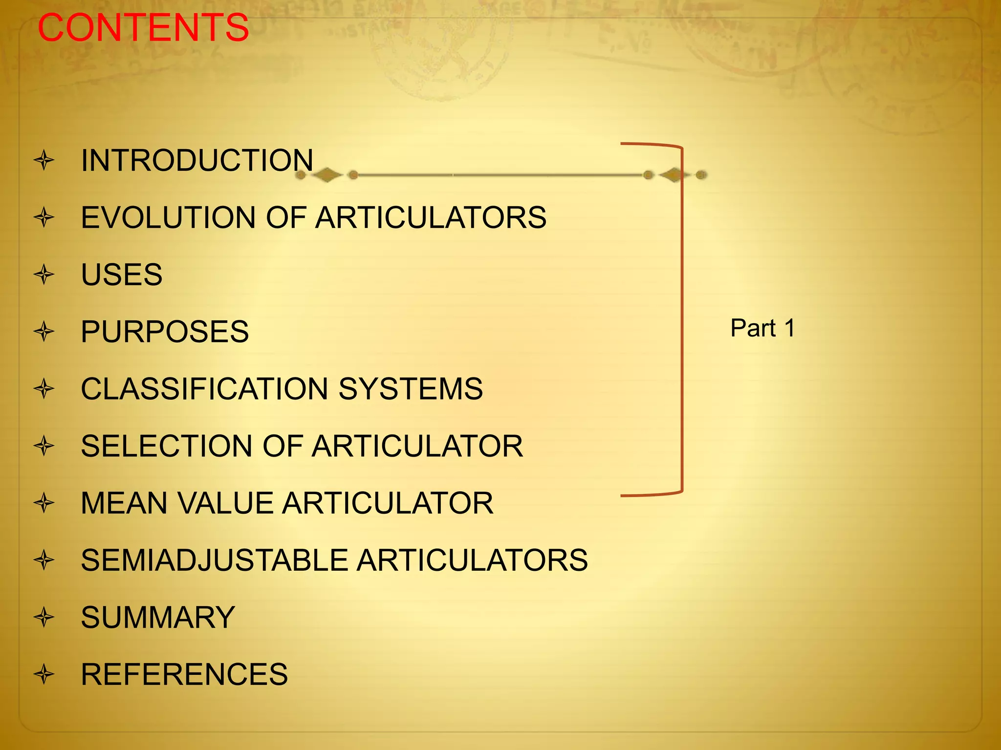 The document discusses articulators, which are mechanical instruments that represent the temporomandibular joints and jaws. Articulators have evolved over time from simple plaster models to more advanced instruments. They serve several purposes, including holding dental casts to simulate jaw movements for diagnosing occlusion and fabricating dental restorations. The document outlines the classification of articulators according to different systems, requirements of articulators, and their uses in prosthodontic treatment.