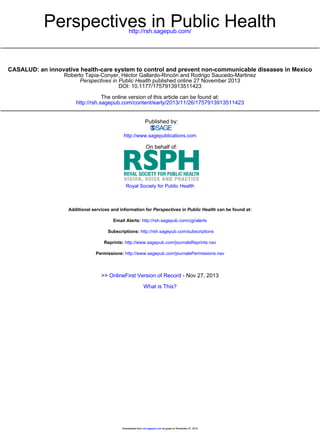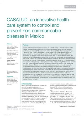 The document describes CASALUD, an innovative healthcare system in Mexico to control and prevent non-communicable diseases (NCDs) like diabetes and cardiovascular disease. It was created in response to Mexico facing a dramatic rise in NCDs due to aging populations and increasingly sedentary lifestyles. CASALUD leverages international best practices and innovative technology to deliver NCD care, control, and prevention through proactive strategies, expanded access to services, and ongoing professional education for healthcare providers. Initial implementation showed promising results, and the system is planned for wider adoption across Mexico in partnership with the Ministry of Health.