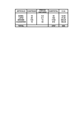 ARTICULO CANTIDAD SUBTOTAL I.V.A