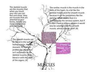 The document discusses different types of tissues in the human body including muscle tissues, nervous tissues, epithelial tissues, and connective tissues. It provides descriptions of skeletal muscle, cardiac muscle, smooth muscle, neurons, dendrites, axons, simple squamous epithelium, stratified squamous epithelium, simple cuboidal epithelium, pseudostratified columnar epithelium, areolar connective tissue, adipose tissue, collagenous fibers, reticular fibers, and elastic fibers. Examples of where each tissue is found in the body are also provided.