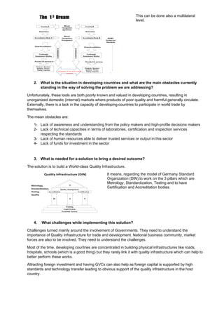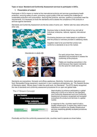 This document discusses how developing countries can participate in global value chains through standards and conformity assessment. It notes that lacking awareness, technical capacity, human resources, and funds are major obstacles currently preventing developing countries from effectively participating. The solution proposed is for countries to build a world-class quality infrastructure system, including organizations for metrology, standardization, testing, certification and accreditation. Implementing this poses challenges requiring government and private sector involvement and understanding of the importance of quality infrastructure for trade and development. If countries invest in developing such infrastructure, it will help their products meet international standards and allow them to attract foreign investment and participation in global value chains, thereby creating wealth.