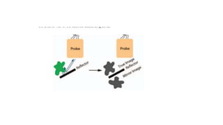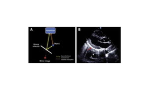 This document discusses various types of artifacts that can occur in echocardiography and their causes. It describes artifacts related to ultrasound properties like reflection, refraction, scattering, attenuation and beam width. Common artifacts include reverberation between two reflective surfaces, ring down from gas bubbles, shadowing from highly attenuating structures, mirror images from multiple reflections, and refraction artifacts from structures acting as lenses. Side lobe and grating lobe artifacts result from secondary beams around the main ultrasound beam. Near field clutter and blooming/color bleed can obscure structures. Pseudoflow shows motion of non-blood fluids. Twinkling artifacts can mimic abnormal flow near reflective surfaces. Figure of 8 artifacts can occur around intracardiac devices