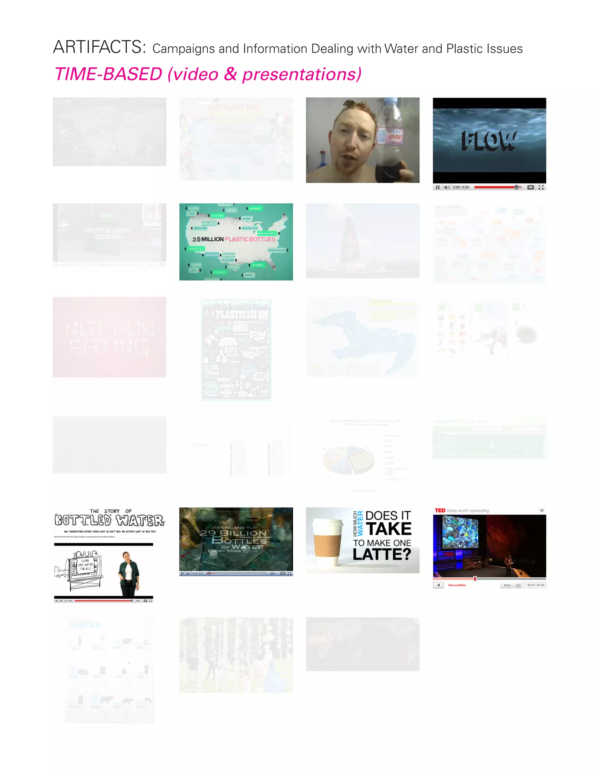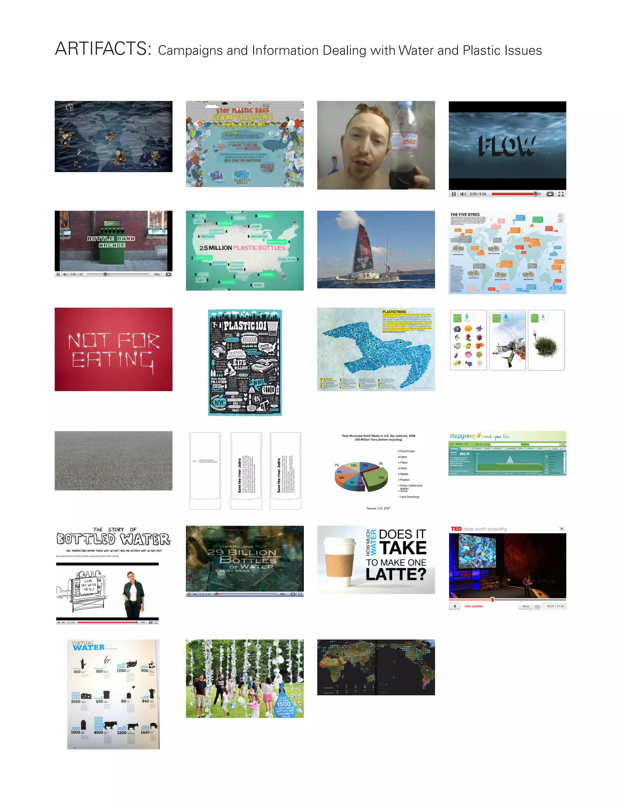 This document categorizes different types of artifacts, campaigns and information dealing with water and plastic issues. It identifies time-based videos and presentations, interactive digital and online content, physical objects and exhibits, posters and print materials. It also analyzes how some artifacts track users' own actions, invoke social norms, use statistics, explicitly encourage action, aim to be entertaining or funny, and take mostly negative, positive or neutral emotional tones in their messages.