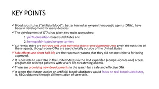 Artificial blood substitutes, also called oxygen therapeutic agents (OTAs), have been in development for decades using two main approaches: perfluorocarbon-based substitutes and hemoglobin-based carriers. Currently, there are no FDA-approved OTAs due to toxicities. Promising new developments include stem cell-derived red blood cells, which could provide an unlimited source with high similarity to natural red blood cells. Future studies may focus on producing safe and effective red blood cells from differentiated stem cells.