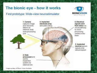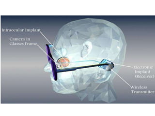 The artificial retina technology known as the Argus II has been approved for use in the US. It consists of a camera mounted on glasses that transmits images wirelessly to a microelectrode array implanted on the retina. The array stimulates the retina to produce spots of light that the brain interprets as vision. The Argus II is intended for those aged 25+ who have lost light perception due to retinitis pigmentosa. It allows them to identify objects, read large letters, and navigate independently. While a breakthrough, the device is very expensive and remains inaccessible to many.