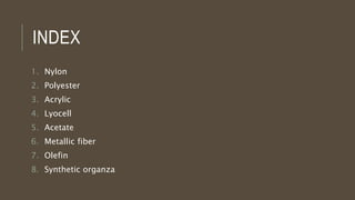The document provides an overview of various artificial and natural fabrics, detailing their sources, textures, maintenance requirements, and typical interior uses. Each fabric, such as nylon, polyester, satin, and wool, is described with specific characteristics that highlight their applications in home furnishings and textiles. Additionally, it includes references for further information on each fabric type.