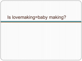 This document discusses artificial insemination as a way to conceive without sexual intercourse. It describes the different methods of artificial insemination, including intravaginal, intracervical, and intrauterine insemination. There are two types: homologous insemination using the husband's sperm, and heterologous insemination using a sperm donor. Justifications for homologous insemination include male impotence or infertility. The document also analyzes artificial insemination through the lenses of different ethical theories and their varying views on whether it is moral or immoral.