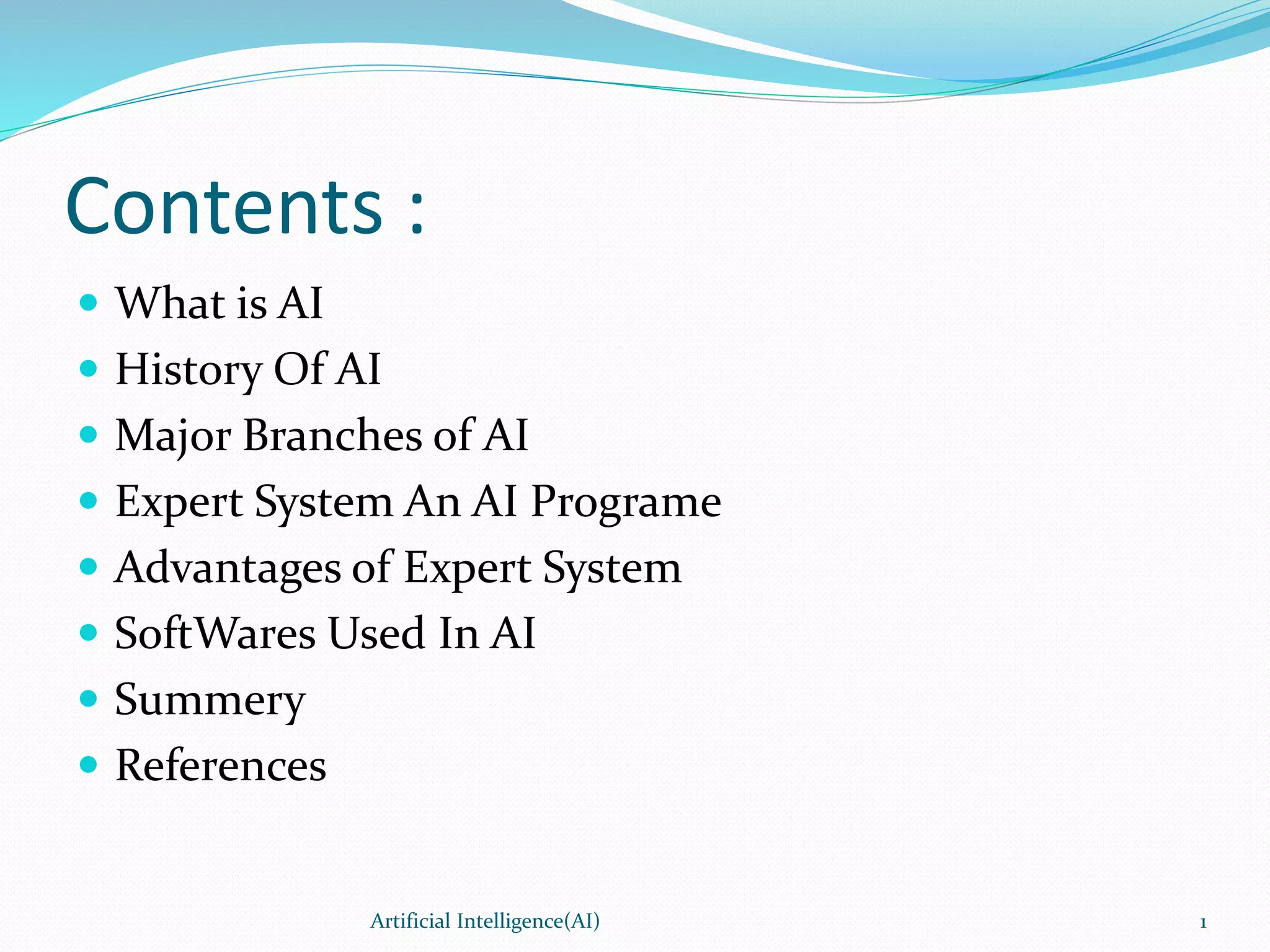 This document provides an overview of artificial intelligence (AI), including its history, major branches, expert systems, and applications. It discusses how AI aims to build intelligent machines that can think and act like humans. The major branches covered are perceptive systems, robotics, expert systems, learning systems, natural language processing, and neural networks. Expert systems are described as AI programs that store knowledge and make inferences to emulate human experts. The document also outlines the typical components of an expert system, including the knowledge base, inference engine, and user interface. Common AI software mentioned includes CLIPS, Weka, and MOEA Framework.