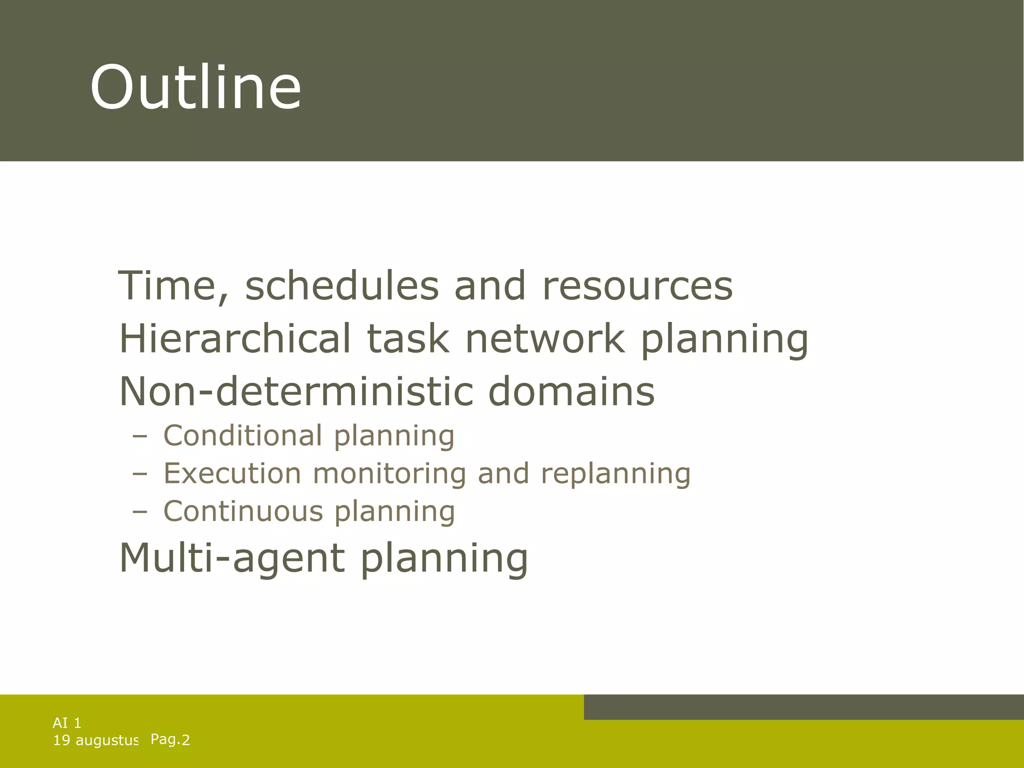 The document discusses planning for problems with time, resources, and uncertainty. It covers job shop scheduling, hierarchical task network planning, conditional planning for non-deterministic domains, and techniques for monitoring plan execution and replanning if needed to handle unexpected outcomes or state changes. Key concepts include temporal planning with durations and timelines, resource constraints, hierarchical decomposition, conditional branches, belief states for partial observability, and replanning to repair or replace plans that fail during execution.