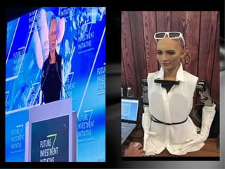 The document provides a history of artificial intelligence, key figures in AI development, and examples of modern AI technologies. It discusses how the idea of AI originated in ancient Greece and how Alan Turing introduced the Turing test in 1937. Examples of modern AI include Sophia, a humanoid robot created by Hanson Robotics, and Rashmi, an Indian humanoid robot that can speak three languages. The document outlines advances in AI and its applications in fields such as military technology, space exploration, healthcare, and more.