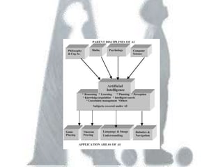 Artificial intelligence has its origins in humans' desire to create intelligent models and statues of themselves, and early work using technologies like Babbage's Analytical Engine and thermoionic valves. The document discusses several approaches to problem solving in AI like state space searches, as well as major topics in the field including learning systems, knowledge representation, planning, knowledge acquisition, and fuzzy logic and artificial neural networks. It provides an overview of the history and concepts within the study of artificial intelligence.