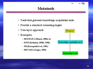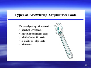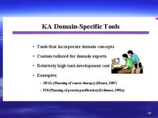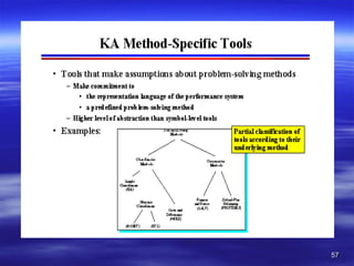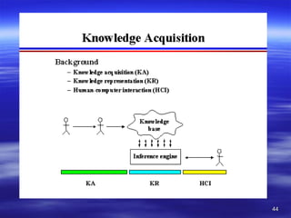 Artificial Intelligence (AI) refers to computer systems that exhibit intelligence capabilities. The document discusses knowledge representation, knowledge engineering, and expert systems, emphasizing the significance of expert knowledge in developing knowledge-based systems. It also outlines various knowledge types, acquisition techniques, and the challenges of knowledge engineering, including the roles of knowledge representation in AI.