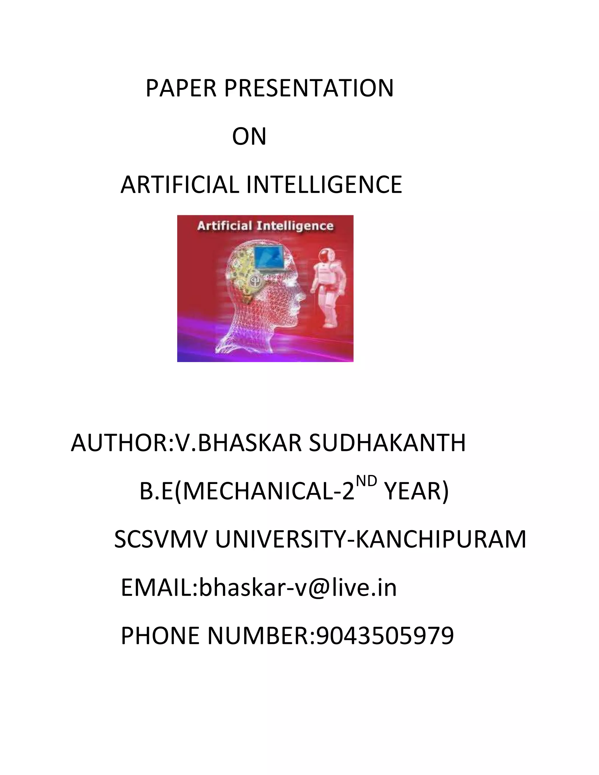 This document provides an overview of artificial intelligence and its applications. It begins with an introduction defining AI as giving machines human-like thinking abilities. It then discusses how AI works through techniques like planning, pattern recognition, ontology, robotics, and more. Applications of AI discussed include medicine, the military, games, language processing, and expert systems. The document concludes with predictions for AI's future role in technologies like telephone translation, expanded use of expert systems, passing the Turing test, and research assistants.