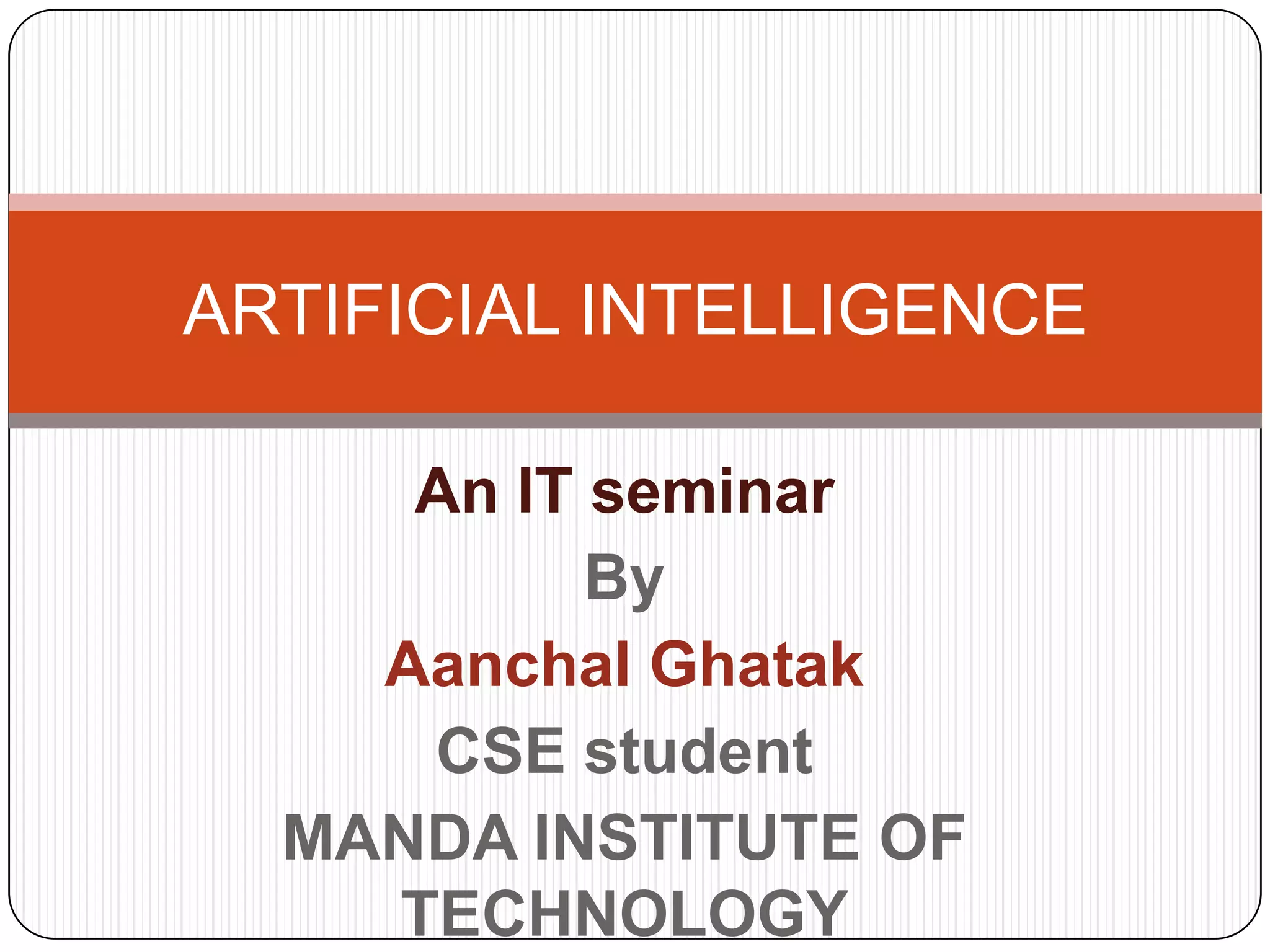 This document summarizes an IT seminar about artificial intelligence. It defines intelligence and AI, discussing early pioneers like Alan Turing. It provides examples of modern AI applications, including facial and speech recognition, learning, planning, and problem solving. Bees' ability to recognize faces from different angles is discussed, as well as conversational bots like Buddhabot. Research into building cognitive computers that mimic the brain is also summarized. The document concludes with discussing limitations of AI and potential future applications.