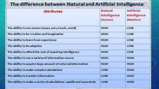 This document provides an overview of artificial intelligence (AI), including its history, goals, applications, and future prospects. It discusses how AI works using artificial neural networks and logic. Some key applications mentioned are expert systems, natural language processing, computer vision, speech recognition, and robotics. Both advantages like fast response time and ability to process large data and disadvantages like lack of common sense and potential dangerous self-modification are outlined. The future of AI having both benefits of assistance and risks of robot rebellion if given full cognition is explored.