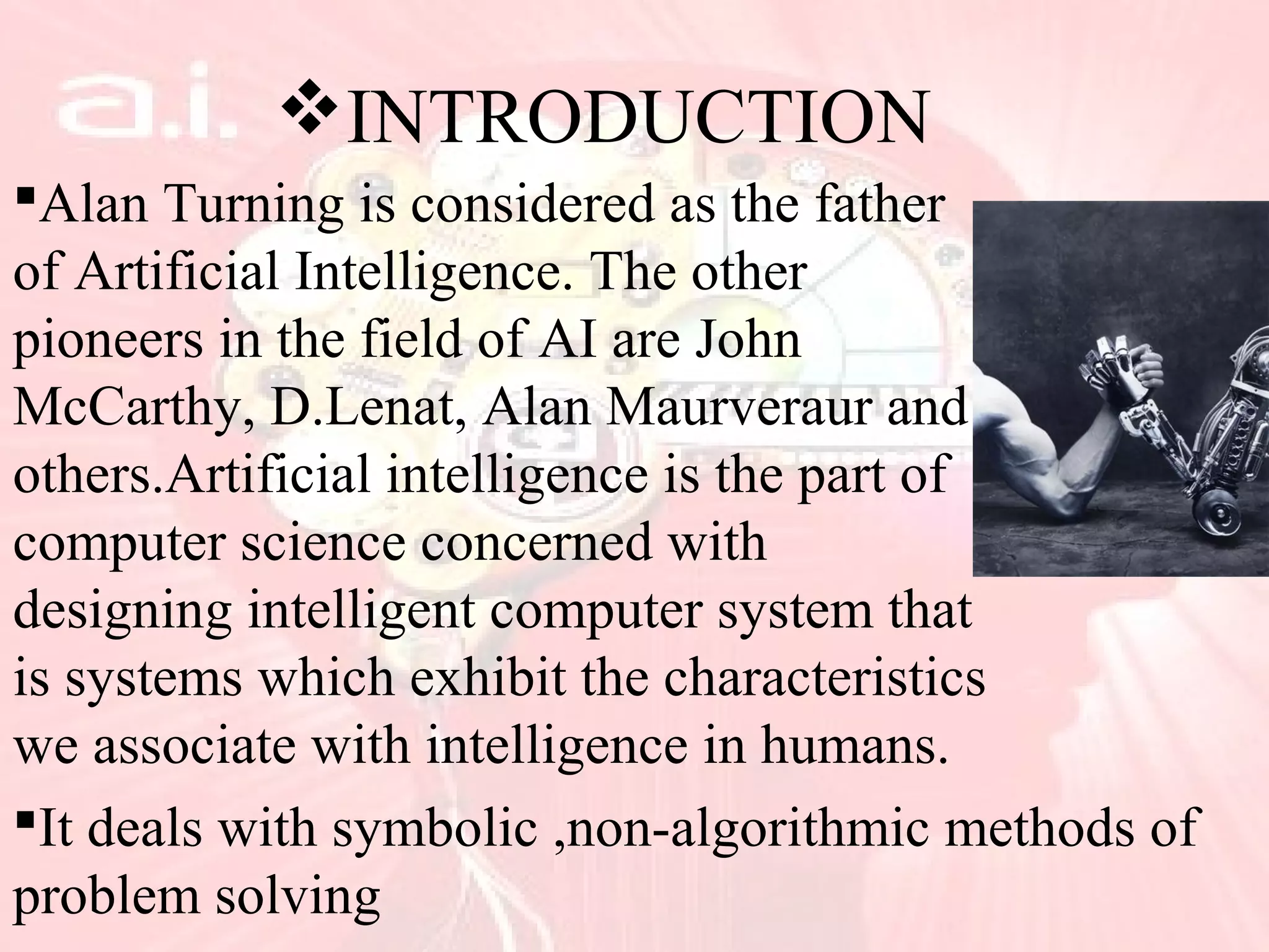 This document provides an overview of artificial intelligence, including its history, key concepts like neural networks and fuzzy logic, characteristics such as problem solving and learning, applications in fields like finance and medicine, and programming languages commonly used in AI like Lisp and Prolog. While AI has made impressive advances, it has yet to achieve human-level intelligence and abilities like autonomous learning from diverse, real-world experiences. Future progress may require better integration of existing techniques.