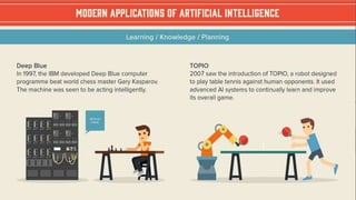 This document provides an overview of artificial intelligence (AI), including its history, categories, branches, applications, and tools. It discusses how AI has evolved through different generations of computing. Key topics covered include expert systems, neural networks, programming languages used in AI, the American Association for Artificial Intelligence (AAAI), and perspectives on AI's future potential impacts and applications.