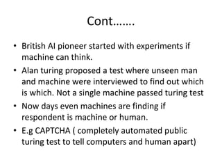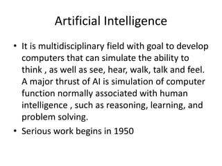 Artificial Intelligence is a multidisciplinary field that aims to develop computers that can think and perceive like humans. Serious work in AI began in the 1950s with experiments on machine thinking. The Turing test, proposed by Alan Turing, tests a machine's ability to have an intelligent conversation indistinguishable from a human. Modern applications of AI include CAPTCHAs, which test if a user is human or computer. Key domains of AI include expert systems, learning systems, robotics, natural language processing, and more. Machine learning allows software to learn from data and experience to improve tasks like speech recognition, video recommendations, traffic prediction, and digital advertising auctions.