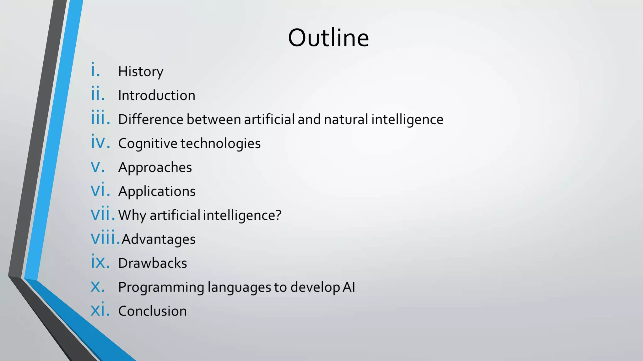 Artificial intelligence (AI) is software that allows computers and robots to perform tasks in a way that mimics human intelligence. John McCarthy first proposed the term "artificial intelligence" in 1956. AI uses techniques like machine learning, natural language processing, and computer vision to perform tasks previously only done by humans, such as playing games, recognizing speech, and understanding language. While AI has advantages like efficiency, reliability, and ability to handle complex tasks, it also has drawbacks like limited ability and lack of complete human traits. The ultimate goal of AI research is to solve problems humans cannot.