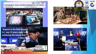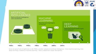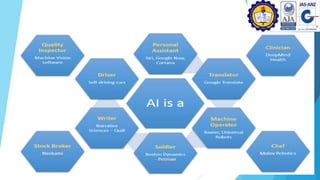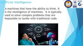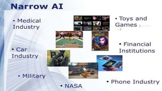 This document discusses artificial intelligence and its applications. It defines strong AI as attempting to create human-level intelligence in machines, while weak AI focuses on narrow applications using machine learning. Some advantages of AI include reducing errors, exploring dangerous environments, and assisting with repetitive tasks. Challenges include the high cost of development and an inability to match human creativity or emotions. The document outlines several applications of AI in fields like transportation, the military, art, business, education, and hotels.