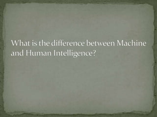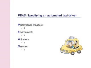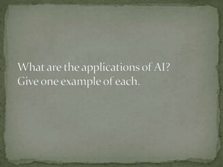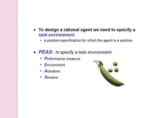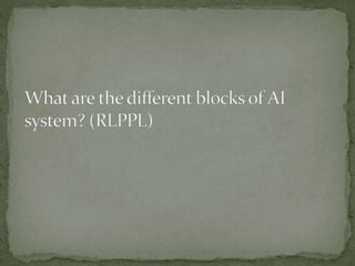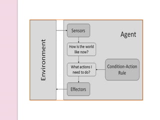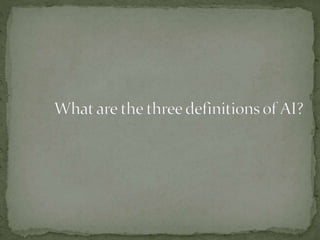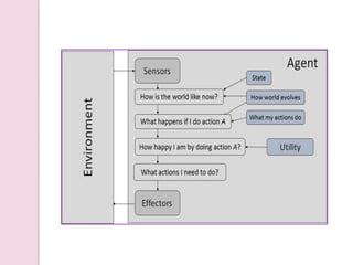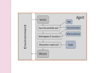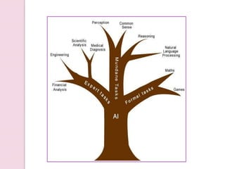 The document provides an overview of artificial intelligence (AI), detailing its definition, goals, techniques, applications, and historical milestones. It discusses the various disciplines contributing to AI, types of intelligence, and the differences between human and machine intelligence. Additionally, it outlines the role of AI in fields such as gaming, natural language processing, and robotics, while also categorizing AI tasks and agents.