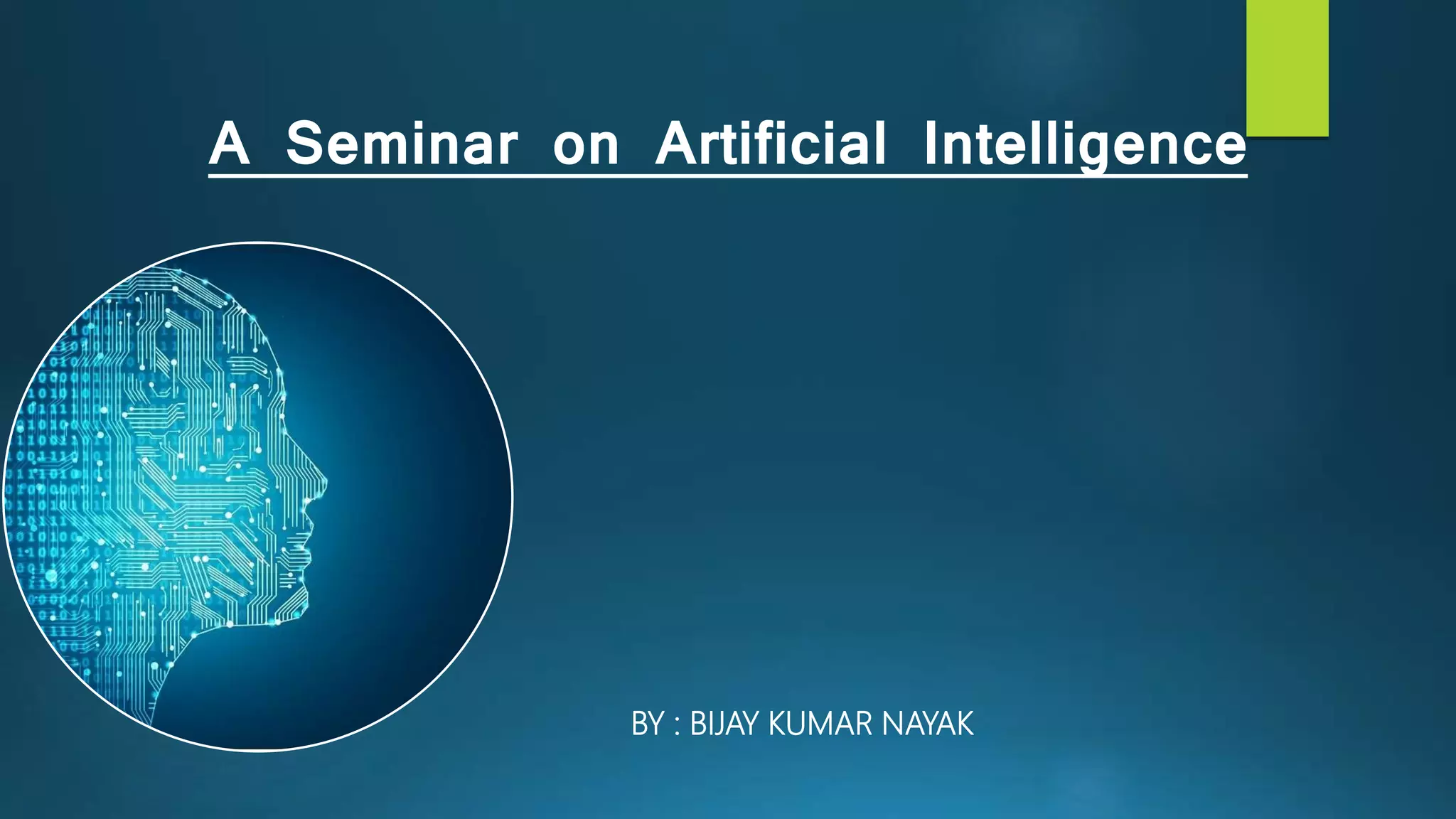 The seminar on artificial intelligence by Bijay Kumar Nayak covers the fundamentals of AI, its branches, and applications across various industries. It highlights the significance of AI in enhancing efficiency, accuracy, and data processing, while also discussing its challenges and impact on employment. The document emphasizes the future potential of AI, including the growing demand for professionals in the field and the possibility of AI replacing human tasks.