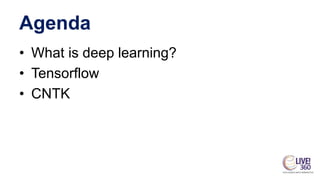 The document provides an overview of deep learning, focusing on Microsoft’s tools like TensorFlow and CNTK for developing deep neural networks. It covers essential concepts such as neural networks, vectors, matrices, tensors, and their applications in various fields, including object detection and training robots. Additionally, it discusses the design methodology, features, and environment for getting started with TensorFlow and CNTK.