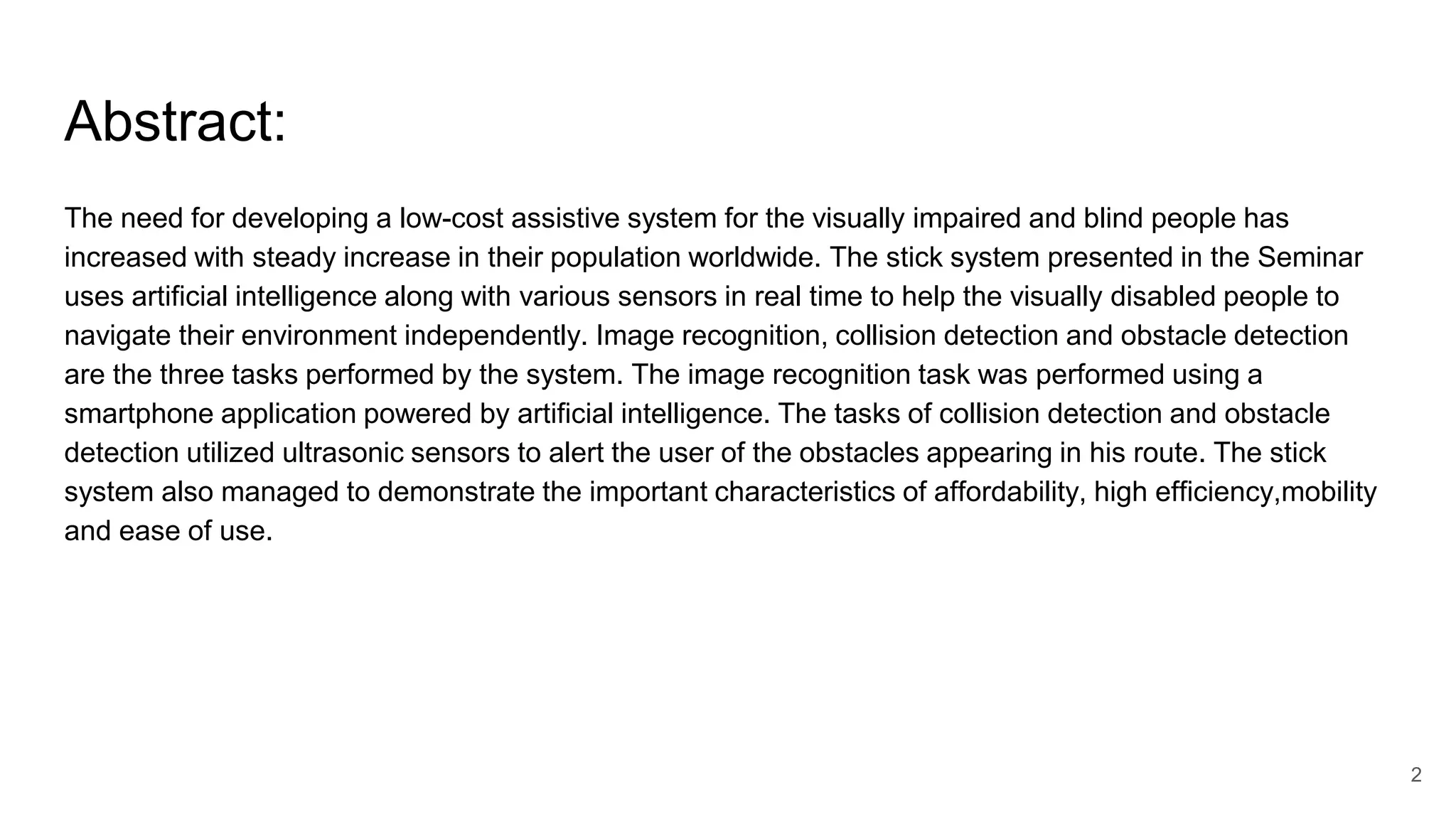 The document presents a low-cost assistive system for visually impaired individuals that integrates artificial intelligence and various sensors to facilitate independent navigation. The system performs image recognition, collision detection, and obstacle detection using a combination of a smartphone application and hardware components like ultrasonic sensors and a microcontroller. It addresses affordability and effectiveness issues prevalent in existing assistive technologies, particularly for low-income users.