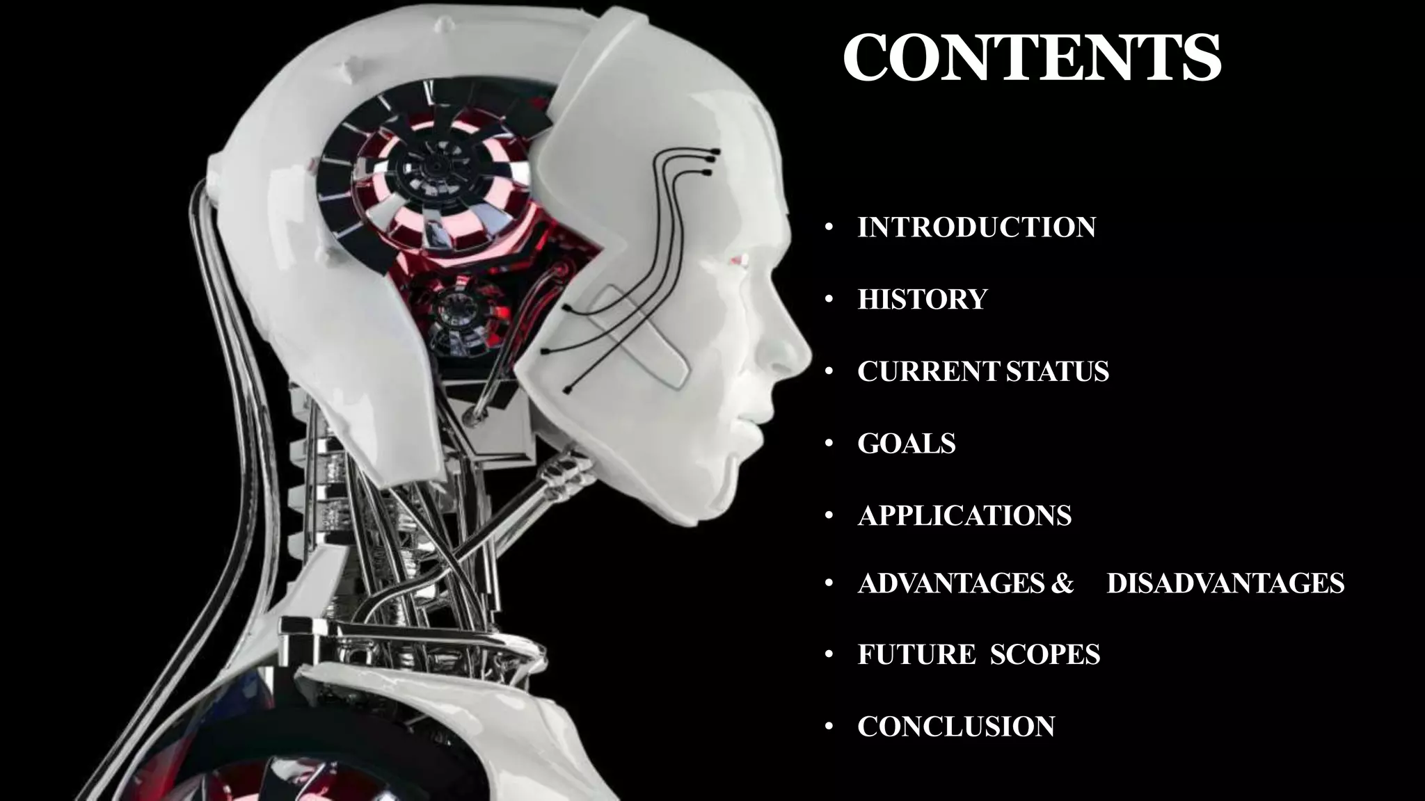 The document provides an overview of artificial intelligence (AI), including its history, current status, goals, applications, advantages, and future. It discusses how AI has progressed from early concepts in the 1950s to today's applications in fields like healthcare, aviation, education, and finance. The document also outlines challenges like cost, job loss, and machine ethics, but envisions continued improvements in areas like speech and image recognition, with AI playing a growing role across many aspects of life in the next decade.