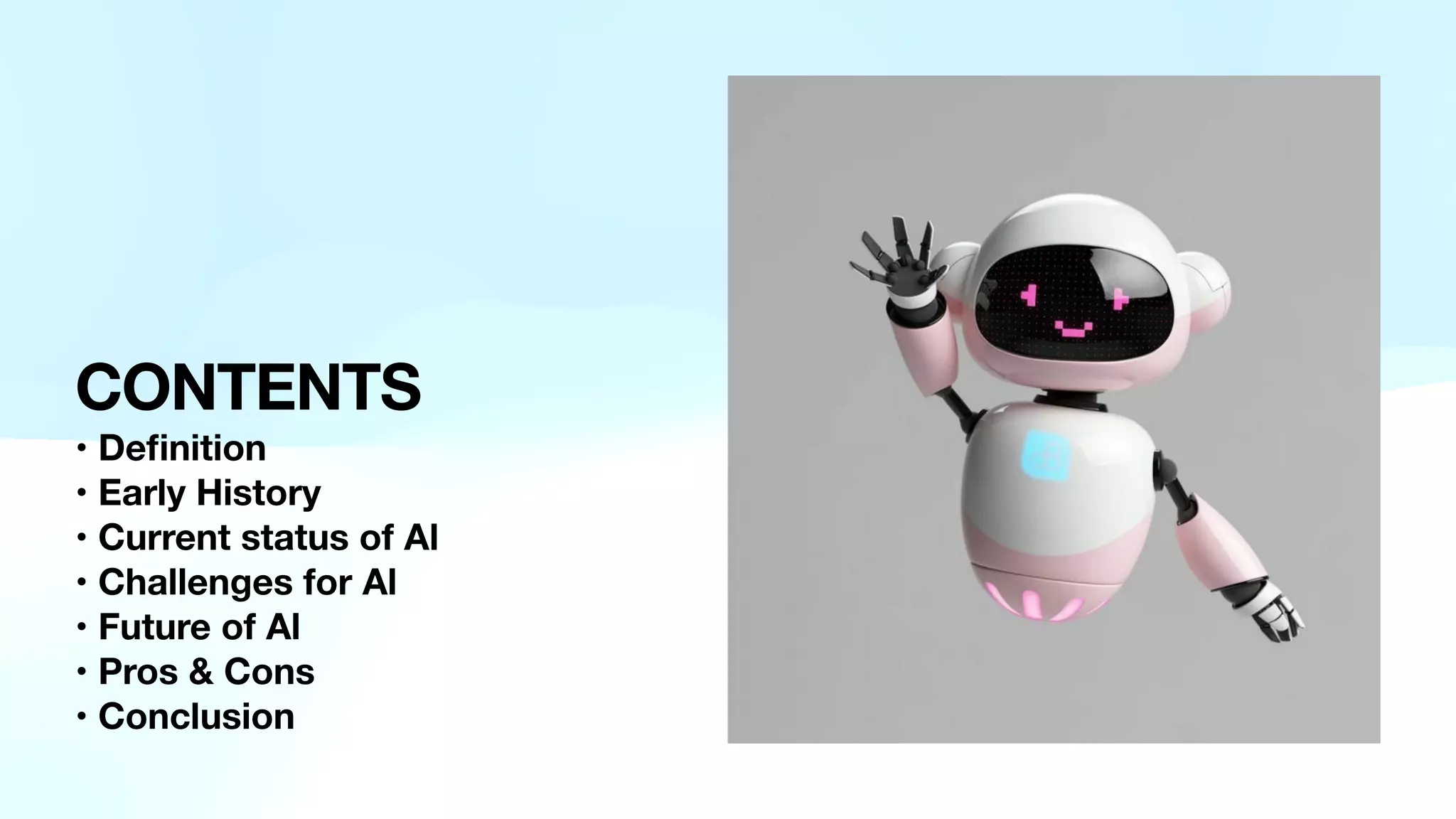 This document provides an overview of artificial intelligence (AI), including definitions, a brief history, current applications, challenges, and the future of AI. It discusses early pioneers in AI like Alan Turing and John McCarthy and how AI has progressed from theoretical discussions to applications in digital assistants, games, robotics, and more through advances in deep learning. Both pros and cons of AI are presented, with the future of AI predicted to include self-driving cars, improved healthcare, and space exploration. The document concludes that AI aims to create machine intelligence through studying and designing intelligent agents.