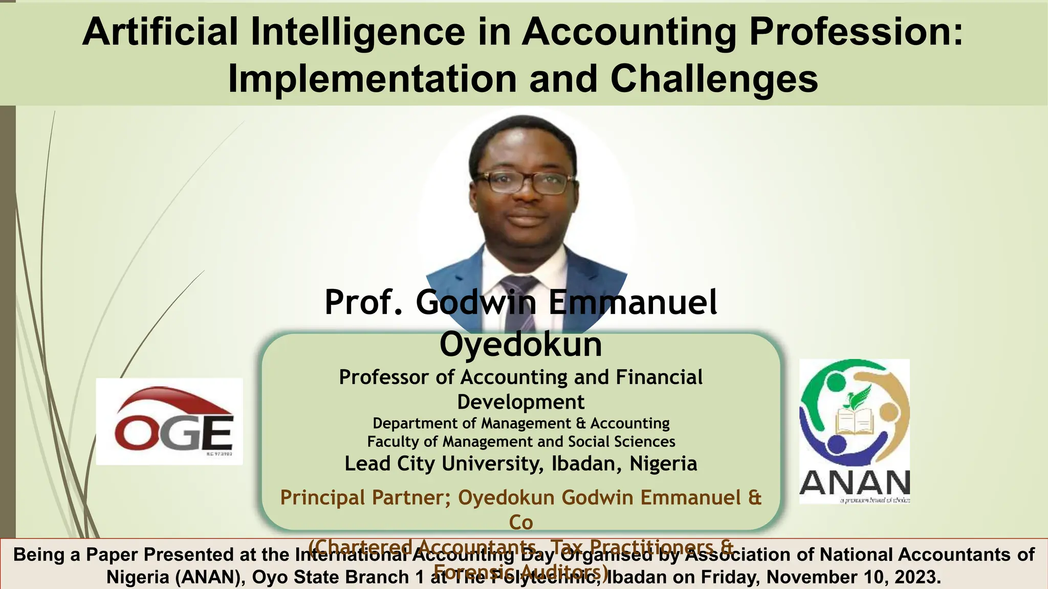 The paper presented at the International Accounting Day discusses the transformative impact of artificial intelligence (AI) on the accounting profession, highlighting its potential to enhance efficiency, accuracy, and decision-making in Nigeria. Despite its advantages, the implementation of AI faces challenges, such as infrastructural issues and the need for skilled labor, while also raising ethical concerns and the importance of compliance with regulatory standards. To effectively adopt AI, the paper suggests starting small, securing team buy-in, and investing in training to navigate this technological shift.
